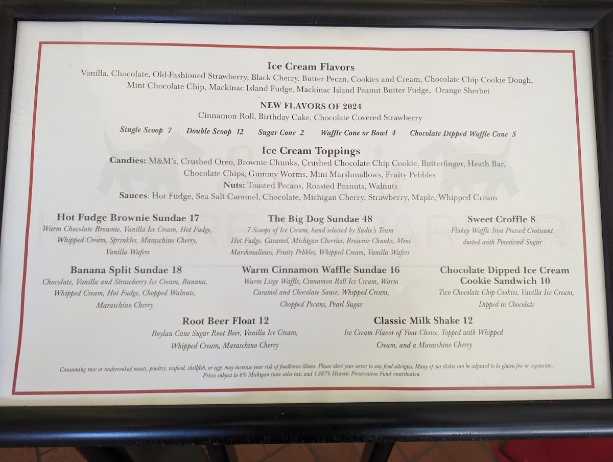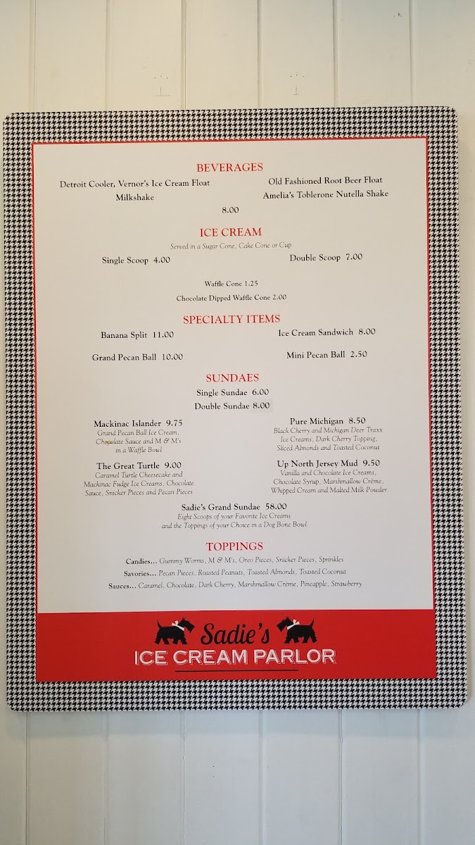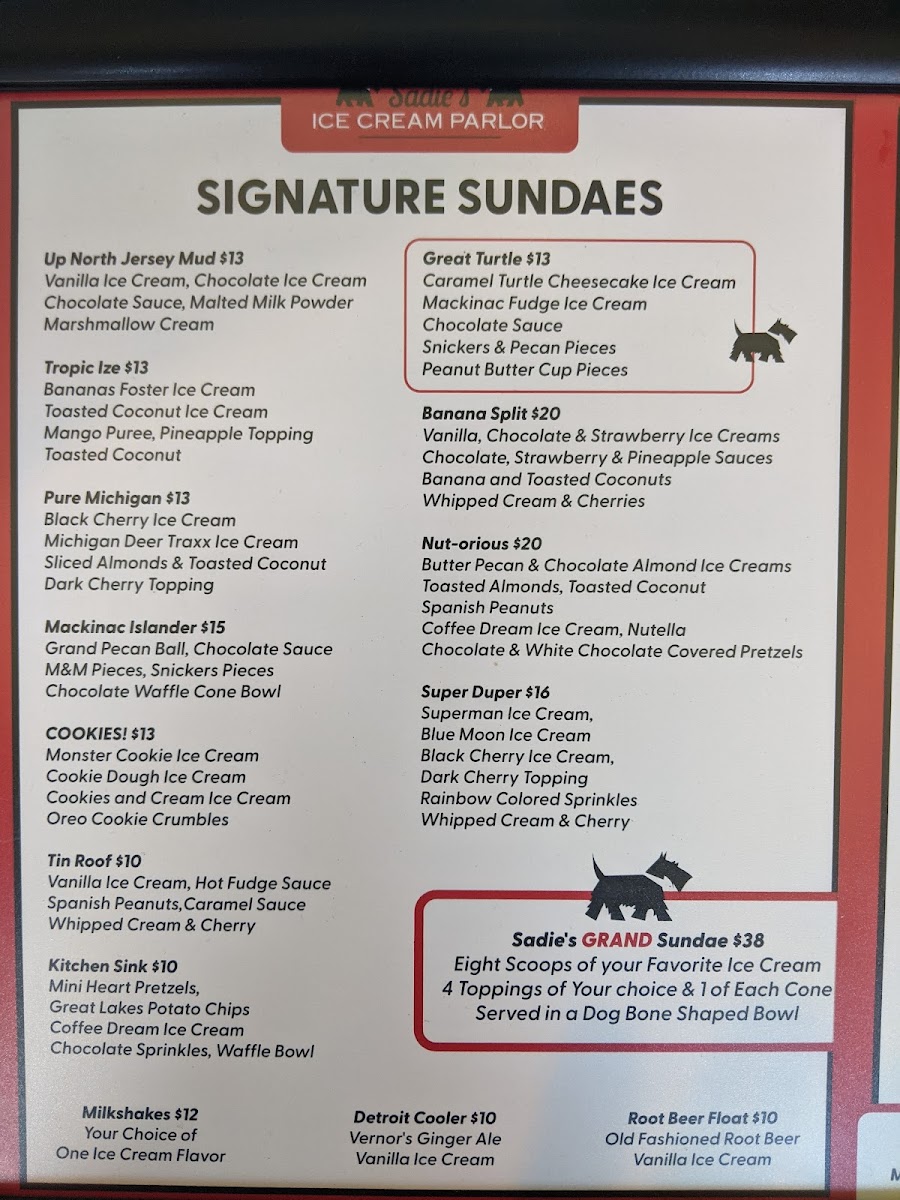 In conclusion, Sadie’s Ice Cream provides a delightful mix of drinks, sundaes, and specialty items that will satisfy any craving, all served in the charming setting of Mackinac Island. Whether you're in the mood for something classic or something with a bit more flair, Sadie’s menu has something for everyone.